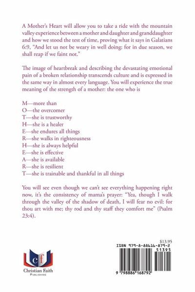 A Mother's Heart A Mother's Heart will allow you to take a ride with the mountain valley experience between a mother and daughter and granddaughter and how we stood the test of time, proving what it says in Galatians 6:9, "And let us not be weary in well doing: for in due season, we shall reap if we faint not." The image of heartbreak and describing the devastating emotional pain of a broken relationship transcends culture and is expressed in the same way in almost every language. You will experience the true meaning of the strength of a mother: the one who is M--more than O--the overcomer T--she is trustworthy H--she is a healer E--she endures all things R--she walks in righteousness H--she is always helpful E--she is effective A--she is available R--she is resilient T--she is trainable and thankful in all things You will see even though we can't see everything happening right now, it's the consistency of mama's prayer: "Yea, though I walk through the valley of the shadow of death, I will fear no evil: for thou art with me; thy rod and thy staff they comfort me" (Psalm 23:4).
