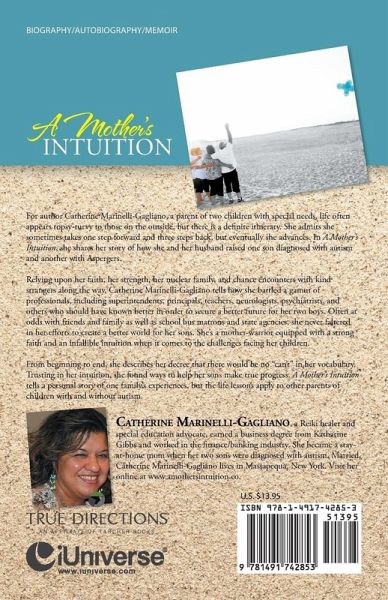 For author Catherine Marinelli-Gagliano, a parent of two children with special needs, life often appears topsy-turvy to those on the outside, but there is a definite itinerary. She admits she sometimes takes one step forward and three steps back, but eventually she advances. In A Mother's Intuition, she shares her story of how she and her husband raised one son diagnosed with autism and another with Aspergers. Relying upon her faith, her strength, her nuclear family, and chance encounters with kind strangers along the way, Catherine Marinelli-Gagliano tells how she battled a gamut of professionals, including superintendents, principals, teachers, neurologists, psychiatrists, and others who should have known better in order to secure a better future for her two boys. Often at odds with friends and family as well as school bus matrons and state agencies, she never faltered in her efforts to create a better world for her sons. She's a mother-warrior equipped with a strong faith and an infallible intuition when it comes to the challenges facing her children. From beginning to end, she describes her decree that there would be no "can't" in her vocabulary. Trusting in her intuition, she found ways to help her sons make true progress. A Mother's Intuition tells a personal story of one family's experiences, but the life lessons apply to other parents of children with and without autism.