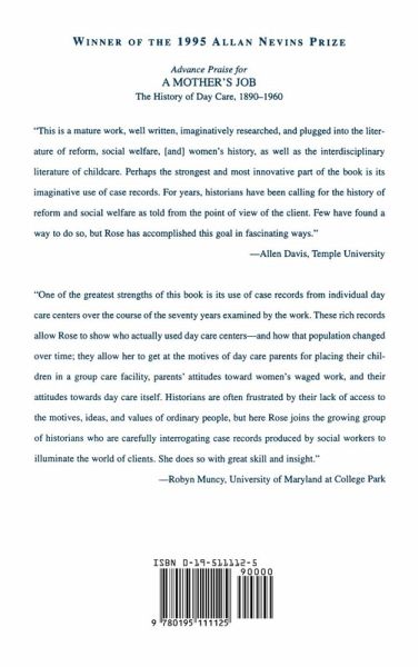This new book traces the transformation of day care from a charity for poor single mothers in the early twentieth century to a socially accepted need of ordinary families by the 1950s. Using Philadelphia as a case study, Elizabeth Rose explores the history of day care from the perspective of the families who used it as well as the philanthropists and social workers who administered it. This study helps us understand the roots of our current dilemmas about day care in the context of debates on welfare, women's work, and "family values".