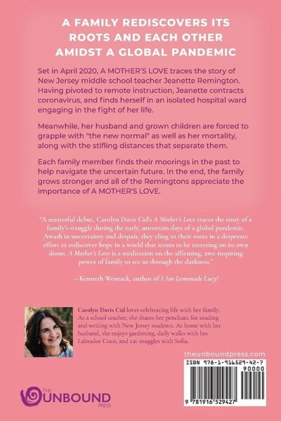 DURING DIFFICULT TIMES, A FAMILY CAN FALL APART... OR GROW TOGETHER. Explore a unique perspective on love, devotion, and family in A Mother's Love. In this emotional and heart-felt novel, a family rediscovers its roots and each other in the midst of a global pandemic. Set in April 2020, A Mother's Love traces the story of New Jersey school teacher Jeanette Remington. When she falls ill, Jeanette finds herself in an isolated hospital ward, where she engages in the fight of her life. Meanwhile, her husband and grown children are forced to grapple with her mortality, along with the stifling distances that separate them. In the end, everyone's lives will change, and each will recognize the importance of A Mother's Love. "A masterful debut, Carolyn Davis Cid's A Mother's Love traces the story of a family's struggle during the early, uncertain days of a global pandemic. Awash in uncertainty and despair, they cling to their roots in a desperate effort to rediscover hope in a world that seems to be teetering on its own doom. A Mother's Love is a meditation on the affirming, awe-inspiring power of family to see us through the darkness." ¿ - Kenneth Womack, author of I Am Lemonade Lucy! Carolyn Davis Cid is a wife, mother of three, grandmother of five, and school teacher who has long nurtured and shared her passion for literature. She joyfully lives in New Jersey with her husband, her chocolate lab Coco, and her tuxedo cat Sofia. Carolyn revels in her growing family and spends as much time as possible outdoors, walking with Coco and tending to her salsa garden. Find out more at: carolyndaviscid.com