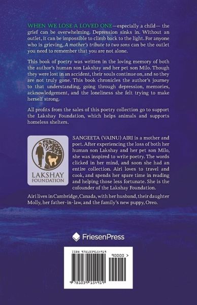 When we lose a loved one-especially a child- the grief can be overwhelming. Depression sinks in. Without an outlet, it can be impossible to climb back to the light. For anyone who is grieving, A mother's tribute to two sons can be the outlet you need to remember that you are not alone. This book of poetry was written in the loving memory of both the author's human son Lakshay and her pet son Milo. Though they were lost in an accident, their souls continue on, and so they are not truly gone. This book chronicles the author's journey to that understanding, going through depression, memories, acknowledgement, and the loneliness she felt trying to make herself strong. All profits from the sales of this poetry collection go to support the Lakshay Foundation, which helps animals and supports homeless shelters.