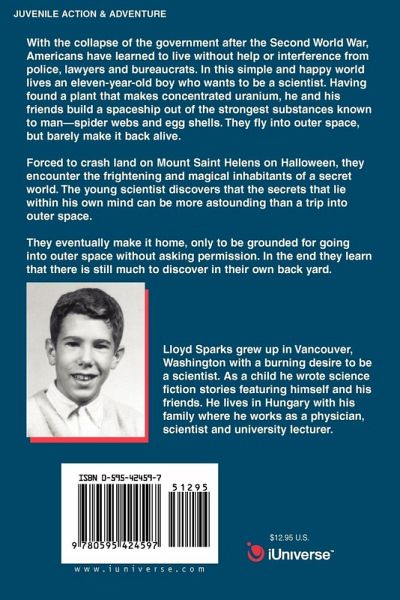 With the collapse of the government after the Second World War, Americans have learned to live without help or interference from police, lawyers and bureaucrats. In this simple and happy world lives an eleven-year-old boy who wants to be a scientist. Having found a plant that makes concentrated uranium, he and his friends build a spaceship out of the strongest substances known to man-spider webs and egg shells. They fly into outer space, but barely make it back alive. Forced to crash land on Mount Saint Helens on Halloween, they encounter the frightening and magical inhabitants of a secret world. The young scientist discovers that the secrets that lie within his own mind can be more astounding than a trip into outer space. They eventually make it home, only to be grounded for going into outer space without asking permission. In the end they learn that there is still much to discover in their own back yard.