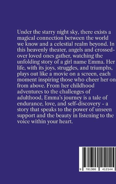 Beneath the starry night sky, there exists a magical connection between the world we know and a celestial realm beyond. In this heavenly theater, angels and crossed-over loved ones gather, watching the unfolding story of a remarkable girl named Emma. Her life, with its joys, struggles, and triumphs, plays out like a movie on a screen, each moment inspiring those who cheer her on from above. From her childhood adventures to the challenges of adulthood, Emma's journey is a tale of endurance, love, and self-discovery-a story that speaks to the power of unseen support and the beauty of living boldly, even in the face fear and doubt.