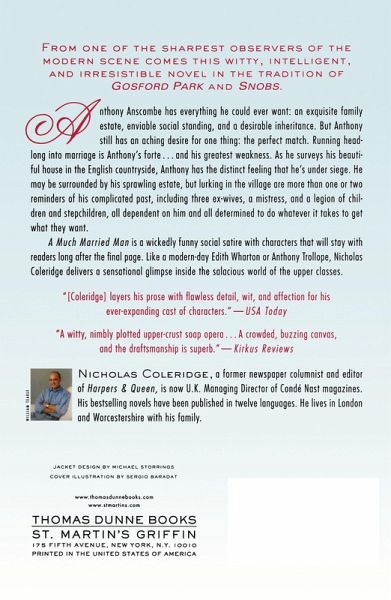 From one of the sharpest observers of the modern scene comes this witty, intelligent, and irresistible novel in the tradition of Gosford Park and Snobs. Anthony Anscombe has everything he could ever want: an exquisite family estate, enviable social standing, and a desirable inheritance. But Anthony still has an aching desire for one thing: the perfect match. Running headlong into marriage is Anthony's forte . . . and his greatest weakness. As he surveys his beautiful house in the English countryside, Anthony has the distinct feeling that he's under siege. He may be surrounded by his sprawling estate, but lurking in the village are more than one or two reminders of his complicated past, including three ex-wives, a mistress, and a legion of children and stepchildren, all dependent on him and all determined to do whatever it takes to get what they want. A Much Married Man is a wickedly funny social satire with characters that will stay with readers long after the final page. Like a modern-day Edith Wharton or Anthony Trollope, Nicholas Coleridge delivers a sensational glimpse inside the salacious world of the upper classes.