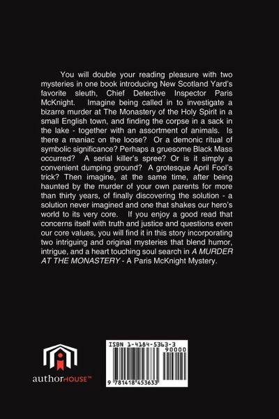 You will double your reading pleasure with two mysteries in one book introducing New Scotland Yard's favorite sleuth, Chief Detective Inspector Paris McKnight. Imagine being called in to investigate a bizarre murder at The Monastery of the Holy Spirit in a small English town, and finding the corpse in a sack in the lake - together with an assortment of animals. Is there a maniac on the loose? Or a demonic ritual of symbolic significance? Perhaps a gruesome Black Mass occurred? A serial killer's spree? Or is it simply a convenient dumping ground? A grotesque April Fool's trick? Then imagine, at the same time, after being haunted by the murder of your own parents for more than thirty years, of finally discovering the solution - a solution never imagined and one that shakes our hero's world to its very core. If you enjoy a good read that concerns itself with truth and justice and questions even our core values, you will find it in this story incorporating two intriguing and original mysteries that blend humor, intrigue, and a heart touching soul search in A MURDER AT THE MONASTERY - A Paris McKnight Mystery.