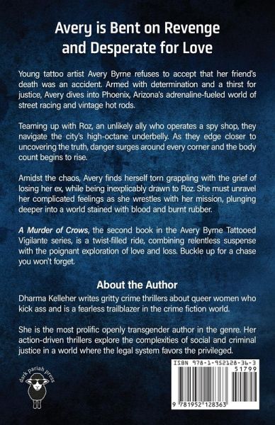 Avery Byrne is bent on revenge and desperate for love. Young tattoo artist Avery Byrne refuses to accept that her friend's death was an accident. Armed with determination and a thirst for justice, Avery dives into Phoenix, Arizona's adrenaline-fueled world of street racing and vintage hot rods. Teaming up with Roz, an unlikely ally who operates a spy shop, they navigate the city's high-octane underbelly. As they edge closer to uncovering the truth, danger surges around every corner and the body count begins to rise. Amidst the chaos, Avery finds herself torn grappling with the grief of losing her ex, while being inexplicably drawn to Roz. She must unravel her complicated feelings as she wrestles with her mission, plunging deeper into a world stained with blood and burnt rubber. A Murder of Crows, the second book in the Avery Byrne Tattooed Vigilante series, is a twist-filled ride, combining relentless suspense with the poignant exploration of love and loss. Buckle up for a chase you won't forget. Buy A Murder of Crows now and join Avery as she and Roz go full throttle in pursuit of a cold-blooded killer.