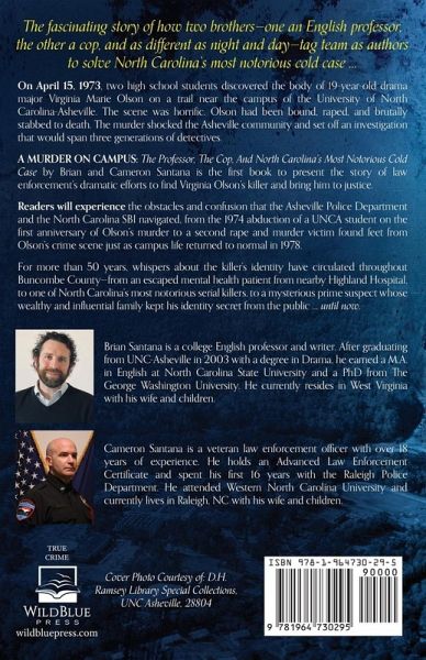 The fascinating story of how two brothers-one an English professor, the other a cop, and as different as night and day-tag team as authors to solve North Carolina's most notorious cold case ... A MURDER ON CAMPUS: The Professor, The Cop, And North Carolina's Most Notorious Cold Case by Brian and Cameron Santana is a true crime investigation that unveils the shocking story behind the brutal 1973 murder on campus of 19-year-old Virginia Marie Olson. On April 15, 1973, two high school students discovered Olson's body near the campus of the University of North Carolina-Asheville. The cold case that followed would span over 50 years, involving three generations of detectives and the Asheville Police Department and North Carolina SBI as they worked tirelessly to uncover the truth. Olson's murder was horrifically violent-she had been bound, raped, and stabbed to death, leaving the Asheville community in shock. The true crime book takes readers through law enforcement's dramatic efforts to find Olson's killer, facing numerous obstacles along the way, from the abduction of another UNCA student in 1974 to a rape and murder victim's body discovered near Olson's crime scene in 1978. Whispers about the killer's identity have circulated for decades, with theories ranging from an escaped mental health patient to one of North Carolina's most notorious serial killers-until now. A MURDER ON CAMPUS is the first to tell the gripping story of this unsolved crime and the surprising twists that led to the authors' revelation of the killer's identity in North Carolina's most notorious cold cases. Written by two brothers, one a cop and the other an English professor, this book offers a unique and fascinating perspective on a case that has haunted Buncombe County for generations.