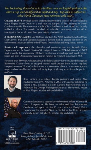 The fascinating story of how two brothers-one an English professor, the other a cop, and as different as night and day-tag team as authors to solve North Carolina's most notorious cold case ... A MURDER ON CAMPUS: The Professor, The Cop, And North Carolina's Most Notorious Cold Case by Brian and Cameron Santana is a true crime investigation that unveils the shocking story behind the brutal 1973 murder on campus of 19-year-old Virginia Marie Olson. On April 15, 1973, two high school students discovered Olson's body near the campus of the University of North Carolina-Asheville. The cold case that followed would span over 50 years, involving three generations of detectives and the Asheville Police Department and North Carolina SBI as they worked tirelessly to uncover the truth. Olson's murder was horrifically violent-she had been bound, raped, and stabbed to death, leaving the Asheville community in shock. The true crime book takes readers through law enforcement's dramatic efforts to find Olson's killer, facing numerous obstacles along the way, from the abduction of another UNCA student in 1974 to a rape and murder victim's body discovered near Olson's crime scene in 1978. Whispers about the killer's identity have circulated for decades, with theories ranging from an escaped mental health patient to one of North Carolina's most notorious serial killers-until now. A MURDER ON CAMPUS is the first to tell the gripping story of this unsolved crime and the surprising twists that led to the authors' revelation of the killer's identity in North Carolina's most notorious cold cases. Written by two brothers, one a cop and the other an English professor, this book offers a unique and fascinating perspective on a case that has haunted Buncombe County for generations.