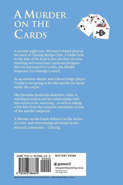 A seventy-eight year old man is found dead at the back of Glenelg Bridge club. A bullet hole in the side of his head is just the first of some startling and sometimes ominous intrigues that are presented to Cecilia, the Health Inspector for Glenelg Council. As an amateur sleuth, and a keen bridge player, Cecilia is not going to let this murder be swept under the carpet. Her favourite homicide detective, Aldo, is missing in action and her relationship with him seems to be wavering...as taking a few hits from the romantic attentions of one of the murder suspects A Murder on the Cards follows Cecilia Archer in a new and entertaining adventure in her beloved community - Glenelg