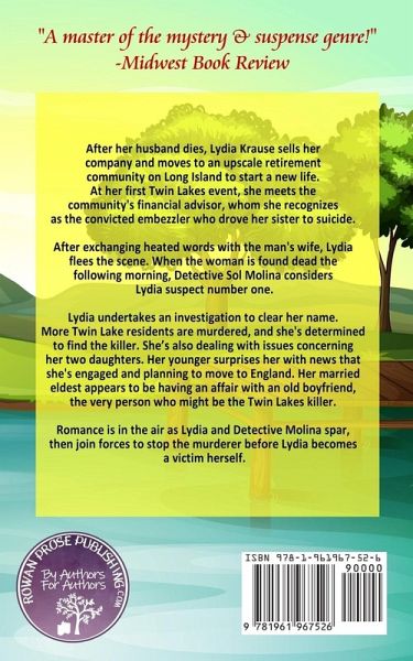 "A master of the mystery & suspense genre." -Midwest Book Review After her husband dies, Lydia Krause sells her company and moves to an upscale retirement community on Long Island to start a new life. At her first Twin Lakes event, she meets the community's financial advisor, whom she recognizes as the convicted embezzler who drove her sister to suicide. After exchanging heated words with the man's wife, Lydia flees the scene. When the woman is found dead the following morning, Detective Sol Molina considers Lydia suspect number one. Lydia undertakes an investigation to clear her name. More Twin Lake residents are murdered, and she's determined to find the killer. She's also dealing with issues concerning her two daughters. Her younger surprises her with news that she's engaged and planning to move to England. Her married eldest appears to be having an affair with an old boyfriend, the very person who might be the Twin Lakes killer. Romance is in the air as Lydia and Detective Molina spar, then join forces to stop the murderer before Lydia becomes a victim herself.