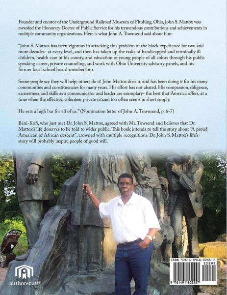 Founder and curator of the Underground Railroad Museum of Flushing, Ohio, John S. Mattox was awarded the Honorary Doctor of Public Service for his tremendous contributions and achievements in multiple community organizations. Here is what John A. Townsend said about him: "John S. Mattox has been vigorous in attacking this problem of the black experience for two and more decades- at every level, and then has taken up the tasks of handicapped and terminally ill children, health care in his county, and education of young people of all colors through his public speaking career, private counseling, and work with Ohio University advisory panels, and his former local school board membership. Some people say they will help; others do it! John Mattox does it, and has been doing it for his many communities and constituencies for many years. His effort has not abated. His compassion, diligence, earnestness and skills as a communicator and leader are exemplary- the best that America offers, at a time when the effective, volunteer private citizen too often seems in short supply. He sets a high bar for all of us." (Nomination letter of John A. Townsend, p. 6-7) Béni-Kofi, who just met Dr. John S. Mattox, agreed with Mr. Towsend and believes that Dr. Mattox's life deserves to be told to wider public. This book intends to tell the story about "A proud American of African descent", crowned with multiple recognitions. Dr. John S. Mattox's life's story will probably inspire people of good will.