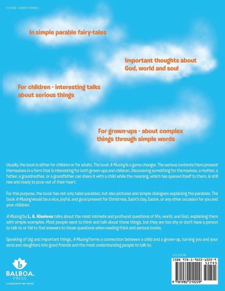 Usually, the book is either for children or for adults. The book A-Musing is a game changer. The serious contents there present themselves in a form that is interesting for both grown-ups and children. Discovering something for themselves, a mother, a father, a grandmother, or a grandfather can share it with a child while the meaning, which has opened itself to them, is still raw and ready to pour out of their heart. For this purpose, the book has not only tales-parables, but also pictures and simple dialogues explaining the parables. The book A-Musing would be a nice, joyful, and good present for Christmas, Saints day, Easter, or any other occasion for you and your children. A-Musing by L. A. Kiseleva talks about the most intimate and profound questions of life, world, and God, explaining them with simple examples. Most people want to think and talk about these things, but they are too shy or dont have a person to talk to or fail to find answers to those questions when reading thick and serious books. Speaking of big and important things, A-Musing forms a connection between a child and a grown-up, turning you and your sons and daughters into good friends and the most understanding people to talk to.