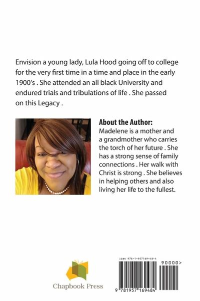 Vision of young lady, Lula Hood going off to college for the very first time in a time and place in the early 1900's . She attended an all black University and endured trials and tribulations of life . She passed on this Legacy . Madelene is a mother and a grandmother who carries the torch of her future . She has a strong sense of family connections . Her walk with Christ is strong . She believes in helping others and also living her life to the fullest.