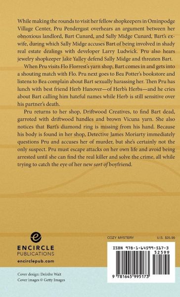 While making the rounds to visit her fellow shopkeepers in Ominpodge Village Center, Pru Pendergast overhears an argument between her obnoxious landlord, Bart Cunard, and Sally Midge Cunard, Bart's ex-wife, during which Sally Midge accuses Bart of being involved in shady real estate dealings with developer Larry Ludwick. Pru also hears jewelry shopkeeper Jake Yalley defend Sally Midge and threaten Bart. When Pru visits Flo Florrest's yarn shop, Bart comes in and gets into a shouting match with Flo. Pru next goes to Bea Potter's bookstore and listens to Bea complain about Bart sexually harassing her. Then Pru has lunch with best friend Herb Hanover-of Herb's Herbs-and he cries about Bart calling him hateful names while Herb is still sensitive over his partner's death. Pru returns to her shop, Driftwood Creatives, to find Bart dead, garroted with driftwood handles and brown Vicuna yarn. She also notices that Bart's diamond ring is missing from his hand. Because his body is found in her shop, Detective James Moriarty immediately questions Pru and accuses her of murder, but she's certainly not the only suspect. Pru must escape attacks on her own life and avoid being arrested until she can find the real killer and solve the crime, all while trying to catch the eye of her new sort of boyfriend.