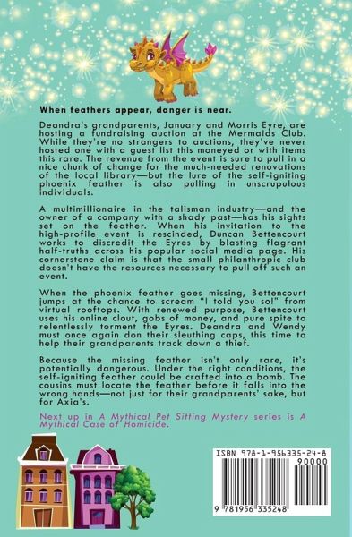 When feathers appear, danger is near. Deandra's grandparents, January and Morris Eyre, are hosting a fundraising auction at the Mermaids Club. While they're no strangers to auctions, they've never hosted one with a guest list this moneyed or with items this rare. The revenue from the event is sure to pull in a nice chunk of change for the much-needed renovations of the local library-but the lure of the self-igniting phoenix feather is also pulling in unscrupulous individuals. A multimillionaire in the talisman industry-and the owner of a company with a shady past-has his sights set on the feather. When his invitation to the high-profile event is rescinded, Duncan Bettencourt works to discredit the Eyres by blasting flagrant half-truths across his popular social media page. His cornerstone claim is that the small philanthropic club doesn't have the resources necessary to pull off such an event. When the phoenix feather goes missing, Bettencourt jumps at the chance to scream "I told you so!" from virtual rooftops. With renewed purpose, Bettencourt uses his online clout, gobs of money, and pure spite to relentlessly torment the Eyres. Deandra and Wendy must once again don their sleuthing caps, this time to help their grandparents track down a thief. Because the missing feather isn't only rare, it's potentially dangerous. Under the right conditions, the self-igniting feather could be crafted into a bomb. The cousins must locate the feather before it falls into the wrong hands-not just for their grandparents' sake, but for Axia's.