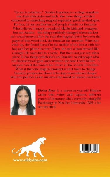 To see is to believe.' Sandra Francisco is a college stundent who hates fairytales and such. She hates things which is connected to something magical especially, greek mythologies. For her, it's just an illusion and people should not fantasize. Who believes in magic nowadays? Maybe kids and teenagers, but not Sandra. But things suddenly changed when she lost her consciousness after she read the magical poem between the pages of that weird book she found at the museum. When she woke up, she found herself in the middle of the forest with her bag and her phone to carry. Then, she met a man dressed like a knight. He takes her to a castle. But that's not just any other place. It has things which she's not familiar, weird people who call themselves as gods and creatures she hasn't seen before. A magical world that awaits her where all the secrets lies within. What if that one magical moment is all it takes to change Sandra's perspective about believing extraordinary things? Will you join her as she uncovers the world of unseen creatures?