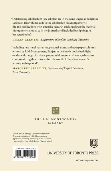 List of Illustrations Acknowledgments A Note on the Author Abbreviations Preface A Note on the Text Part 1: Early and Student Publications The Wreck of the "Marco Polo" A Western Eden From Prince Albert to P.E. Island The Usual Way Extracts from the Diary of a Second Class Mouse High School Life in Saskatchewan Valedictory "Portia" - A Study "Which Has the Most Patience under the Ordinary Cares and Trials of Life - Man or Woman?" Crooked Answers The Bad Boy of Blanktown School James Henry, Truant A Girl's Place at Dalhousie College To the Editor Part 2: Maud Montgomery, Newspaper Woman A Half-Hour in an Old Cemetery Around the Table Half an Hour with Canadian Mothers Christmas Shopping in Halifax Stores Many Admiring Glances Bestowed upon Graduates Netted Doily Innocent Irreverence Part 3: The Upward Climb to Heights Sublime Two Sides of a Life Story The Alpine Path: The Story of My Career Afterword Notes Bibliography Index