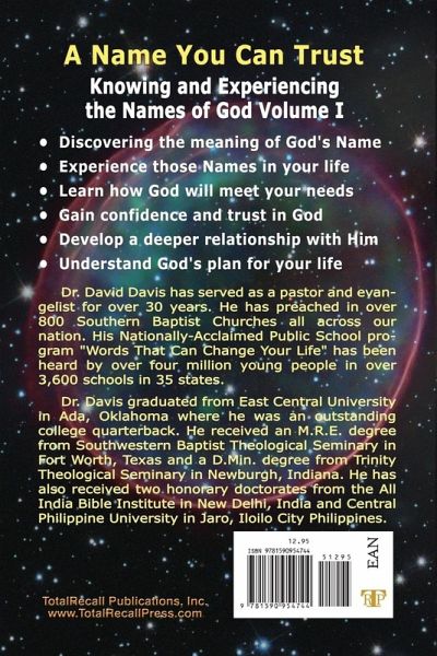 What is in a name? Does your name have a meaning? Can you pronounce your name in different ways? Why is it important that we know the name of our God? As I have traveled all across America, I visit with people who have various needs in life. Quite frankly, when someone shares a need with me, I find myself quickly responding with..."No sweat, God can handle it!" In truth - I have absolutely no problem trusting God... in someone else's life. My problem is when I have a need and I must trust God to come through when I'm at my point of desperation. Ever been there? I'm sure you have. One day, as I was reading Psalm 9:10 - like a bolt of lightning - I said, "That's it! That's the reason why so many of God's people (including myself) have so much trouble in really trusting God is because they really don't know Who this God really is." The Bible says in this verse, "And they that know thy name shall put their trust in thee: for thou, LORD, hast not forsaken them that seek thee." As I began to research the names of God...I began to see the ways that He has revealed Himself, not just as God, but by names that are very personal and practical for His children to experience victory in everyday living as they trust in Him. So what's in a name? When it relates to God... everything! It is my prayer that this book will introduce you to the nature and character of our God in heaven who loves us with an everlasting love. I believe that you will discover that He is not just God in heaven, but a very compassionate and caring heavenly Father who desires to meet every need that you will ever have if you will learn about the God in whom you trust. Believe me...it will make life a lot easier when you know the One who sits on the throne and controls the whole world ...including your world as well.