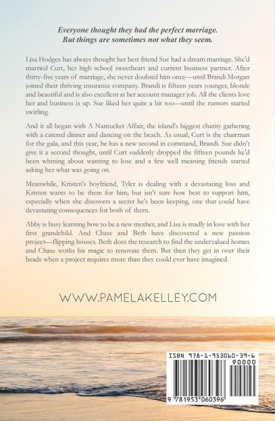 Everyone thought they had the perfect marriage. But things are sometimes not what they seem. Lisa Hodges has always thought her best friend Sue had a dream marriage. She'd married Curt, her high school sweetheart and current business partner. After thirty-five years of marriage, she never doubted him once--until Brandi Morgan joined their thriving insurance company. Brandi is thirty-five, blonde and beautiful and is also excellent at her account manager job. All the clients love her and business is up. Sue liked her quite a bit too--until the rumors started swirling. And it all began with A Nantucket Affair, the island's biggest charity gathering with a catered dinner and dancing on the beach. As usual, Curt is the chairman for the gala, and this year, he has a new second in command, Brandi. Sue didn't give it a second thought, until Curt suddenly dropped the fifteen pounds he'd been whining about wanting to lose and a few well meaning friends started asking her what was going on. Meanwhile, Kristen's boyfriend, Tyler is dealing with a devastating loss and Kristen wants to be there for him, but isn't sure how best to support him, especially when she discovers a secret he's been keeping, one that could have devastating consequences for both of them. Abby is busy learning how to be a new mother, and Lisa is madly in love with her first grandchild. And Chase and Beth have discovered a new passion project--flipping houses. Beth does the research to find the undervalued homes and Chase works his magic to renovate them. But then they get in over their heads when a project requires more than they could ever have imagined.