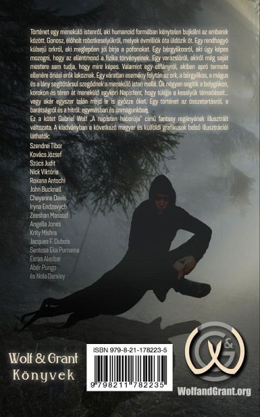 Történet egy menekül¿ istenr¿l, aki humanoid formában kénytelen bujkálni az emberek között. Gonosz, él¿holt robotkesely¿kr¿l, melyek évmilliók óta üldözik ¿t. Egy rendhagyó külsej¿ orkról, aki meglep¿en jól bírja a pofonokat. Egy bérgyilkosról, aki úgy képes mozogni, hogy az ellentmond a fizika törvényeinek. Egy varázslóról, akir¿l még saját mestere sem tudja, hogy mire képes. Valamint egy elflányról, akiben apró termete ellenére óriási er¿k lakoznak. Egy váratlan esemény folytán az ork, a bérgyilkos, a mágus és a lány segít¿társul szeg¿dnek a menekül¿ isten mellé. ¿k négyen segítik a bolygókon, korokon és téren át menekül¿ egykori Napistent, hogy túlélje a kesely¿k támadásait, vagy akár egyszer talán majd le is gy¿zze ¿ket. Egy történet az összetartásról, a barátságról és a hitr¿l: egymásban és önmagunkban. Ez a kötet Gabriel Wolf ¿A napisten háborúja" cím¿ fantasy regényének illusztrált változata. A kiadványban számos magyar és külföldi grafikus/képz¿m¿vész bels¿ illusztrációja látható!