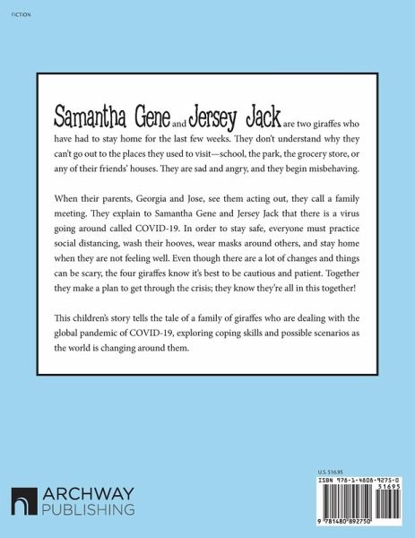 Samantha Gene and Jersey Jack are two giraffes who have had to stay home for the last few weeks. They don't understand why they can't go out to the places they used to visit-school, the park, the grocery store, or any of their friends' houses. They are sad and angry, and they begin misbehaving. When their parents, Georgia and Jose, see them acting out, they call a family meeting. They explain to Samantha Gene and Jersey Jack that there is a virus going around called COVID-19. In order to stay safe, everyone must practice social distancing, wash their hooves, wear masks around others, and stay home when they are not feeling well. Even though there are a lot of changes and things can be scary, the four giraffes know it's best to be cautious and patient. Together they make a plan to get through the crisis; they know they're all in this together! This children's story tells the tale of a family of giraffes who are dealing with the global pandemic of COVID-19, exploring coping skills and possible scenarios as the world is changing around them.