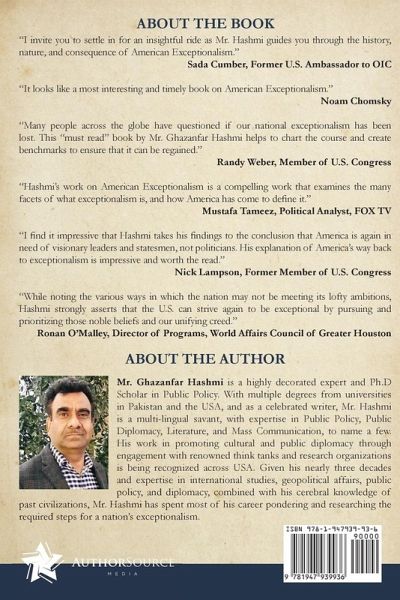"I invite you to settle in for an insightful ride as Mr. Hashmi guides you through the history, nature, and consequence of American Exceptionalism." Sada Cumber, Former U.S. Ambassador to OIC "It looks like a most interesting and timely book on American Exceptionalism." Noam Chomsky "Many people across the globe have questioned if our national exceptionalism has been lost. This "must-read" book by Mr. Ghazanfar Hashmi helps to chart the course and create benchmarks to ensure that it can be regained." Randy Weber, Member of U.S. Congress "Hashmi's work on American Exceptionalism is a compelling work that examines the many facets of what exceptionalism is, and how America has come to define it." Mustafa Tameez, Political Analyst, FOX TV "I find it impressive that Hashmi takes his findings to the conclusion that America is again in need of visionary leaders and statesmen, not politicians. His explanation of America's way back to exceptionalism is impressive and worth the read." Nick Lampson, Former Member of U.S. Congress "While noting the various ways in which the nation may not be meeting its lofty ambitions, Hashmi strongly asserts that the U.S. can strive again to be exceptional by pursuing and prioritizing those noble beliefs and our unifying creed." Ronan O'Malley, Director of Programs, World Affairs Council of Greater Houston