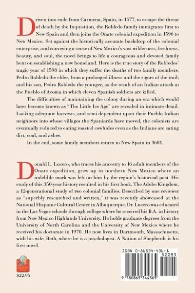 Driven into exile from Carmena, Spain, in 1577, to escape the threat of death by the Inquisition, the Robledo family immigrates first to New Spain and then joins the Onate colonial expedition in 1596 to New Mexico. Set against the historically accurate backdrop of the colonial enterprise, and conveying a sense of New Mexico's vast wilderness, freshness, beauty, and soul, the novel brings to life a courageous and devoted family bent on establishing a new homeland. Here is the true story of the Robledos' tragic year of 1598 in which they suffer the deaths of two family members: Pedro Robledo the elder, from a prolonged illness and the rigors of the trail; and his son, Pedro Robledo the younger, as the result of an Indian attack at the Pueblo of Acoma in which eleven Spanish soldiers are killed. The difficulties of maintaining the colony during an era which would later become known as "The Little Ice Age" are revealed in intimate detail. Lacking adequate harvests, and semi-dependent upon their Pueblo Indian neighbors into whose villages the Spaniards have moved, the colonists are eventually reduced to eating roasted cowhides even as the Indians are eating dirt, coal, and ashes. In the end, some family members return to New Spain in 1601. DONALD LUCERO, who traces his ancestry to 16 adult members of the Onate expedition, grew up in northern New Mexico where an indelible mark was left on him by the region's historical past. His study of this 350-year history resulted in his first book, The Adobe Kingdom, a 12-generational study of two colonial families. Described by one reviewer as "superbly researched and written," it was recently showcased at the National Hispanic Cultural Center in Albuquerque. Dr. Lucero was educated in the Las Vegas schools through college where he received his B.A. in history from New Mexico Highlands University. He holds graduate degrees from the University of North Carolina and the University of New Mexico where he received his doctorate in 1970. He now lives in Dartmouth, Massachusetts, with his wife, Beth, where he is a psychologist. A Nation of Shepherds is his first novel.