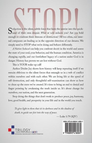 STOP! Seduction is the silent, subtle force that lures the unwise into the quick sand of their own despair. What or who seduces you? Are you bold enough to confront these demons of destruction? All too often, our internal compasses are leading us in the opposite direction of our dreams. We simply need to STOP what we're doing and behave differently. A Nation Seduced - Second Edition can help you confront deceit in the world and assess the state of your soul, your behavior, and the human condition. America is changing rapidly, and our forefathers' legacy of a nation under God is in danger. History has proven we are lost without God. This is YOUR wake-up call! Author Deidre Joy shows how history will keep repeating itself if we remain oblivious to the silent forces that entangle us in a web of conflict within ourselves and with each other. We are living life at the speed of self-destruction, and only thoughtful self-examination can show us how to clean up the mess we've created. It's time to bring an end to denial and finger pointing by awakening the truth inside us. It's about change for ourselves, our nation, and the next generation. Stop doing the things that don't work to produce peace, joy, harmony, love, good health, and prosperity in your life and in the world you touch. To give light to them that sit in darkness and in the shadow of death, to guide our feet into the way of peace. - Luke 1:79 (KJV)