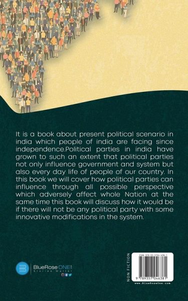 ""It is a book about present political scenario in india which people of india are facing since independence.Political parties in india have grown to such an extent that political parties not only influence government and system but also day to day life of people of our country. In this book we will cover how political parties can influence through all possible perspective which adversely affect whole Nation at the same this book will discuss how it would be if there will not be any political party with some innovative modifications in the system.""