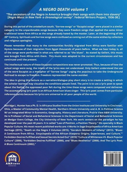 DEATH OF THE NEGRO volume 1 "The ancestors of the Negro in America brought their songs with them into slavery"[Negro Music in New York - a chronological survey". Federal Writers Project, 1936-38.] During the period of the antebellum south, "Sorrow-songs" or "Escapist songs" were placed in a similar category to the unpardonable songs because they were freedom songs that applied the same minor traditional tones from Africa as the songs already hated by the master. Later, at the beginning of the 20th Century, Spirituals and Sorrow songs were confused as coming out of the same whishes by collectors and religious apologists. Please remember that many to the communities forcibly migrated from Africa were familiar with Hymns because of their immigration from Egypt thousands of years before. What we hear today is, all of the song were performed in what are referred to as "the blues". As stated by Gellert, this music was brought from Africa with the,. This music was adapted to the current circumstances and has continued until the present. The intellectual nature of these Escapists compositions was never promoted. Thus, because of how the actual songs were sung, the intent of the lyrics was not understood. Only Gellert understood the use of the word Escapist as a metaphor of "Sorrow Songs" urging the populous to take the Underground Railroad to escape to freedom. Freedom represented the name avoided. The idea in giving this lecture as a narration/dialogue play short story is to create a setting in which the scholar learners may visualize the conditions people lived. The point is to use a lyric poet to speak about the feeling the oppressed poor felt during the time these songs were composed and delivered. The accompanying lyric post is an African American blues singer. This lyric poet comes from particular reference points because his lyrics are universal to all poor people of the world.