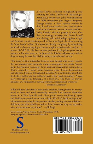 A Neon Tryst is a collection of ekphrastic poems featuring the films L'Eclisse (dir. Michelangelo Antonioni); Seconds (dir. John Frankenheimer); and Wild Strawberries (dir. Ingmar Bergman). Though divided in three separate sections by film, the collection stands as one, cohesive piece, as all main characters share an internal conflict-losing identity with the passage of time.