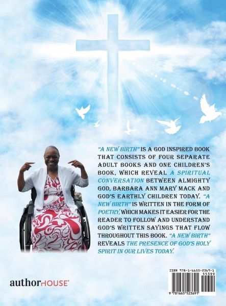 "A NEW BIRTH" is a God inspired book that consists of four separate adult books and one children's book, which reveal a Spiritual Conversation between Almighty God, Barbara Ann Mary Mack and God's Earthly children today. "A NEW BIRTH" is written in the form of Poetry, which makes it easier for the reader to follow and understand God's written Sayings that flow throughout this book. "A NEW BIRTH" reveals the Presence of God's Holy Spirit in our lives today.