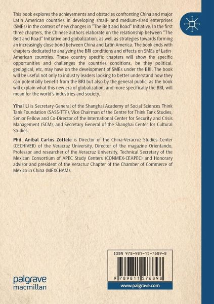 This book explores the achievements and obstacles confronting China and major Latin American countries in developing small- and medium-sized enterprises (SMEs) in the context of new changes in "The Belt and Road" Initiative. In the first three chapters, the Chinese authors elaborate on the relationship between "The Belt and Road" Initiative and globalization, as well as strategies towards forming an increasingly close bond between China and Latin America. The book ends with chapters dedicated to analyzing the BRI conditions and effects on SMEs of Latin-American countries. These country specific chapters will show the specific opportunities and challenges the countries conditions, be they political, geological, etc. may have on the development of SMEs under the BRI. The book will be useful not only to industry leaders looking to better understand how they can potentially benefit from the BRI but also by the general public, as the book will explain what this new era of globalization, andmore specifically the BRI, will mean for the world's industries and society.