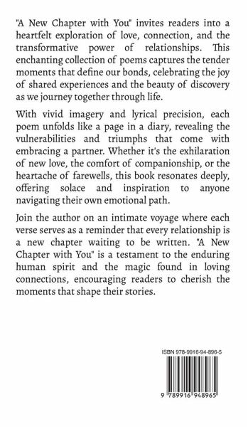 "A New Chapter with You" invites readers into a heartfelt exploration of love, connection, and the transformative power of relationships. This enchanting collection of poems captures the tender moments that define our bonds, celebrating the joy of shared experiences and the beauty of discovery as we journey together through life. With vivid imagery and lyrical precision, each poem unfolds like a page in a diary, revealing the vulnerabilities and triumphs that come with embracing a partner. Whether it's the exhilaration of new love, the comfort of companionship, or the heartache of farewells, this book resonates deeply, offering solace and inspiration to anyone navigating their own emotional path. Join the author on an intimate voyage where each verse serves as a reminder that every relationship is a new chapter waiting to be written. "A New Chapter with You" is a testament to the enduring human spirit and the magic found in loving connections, encouraging readers to cherish the moments that shape their stories.
