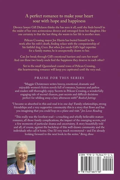 A perfect romance to make your heart soar with hope and happiness Divorce lawyer Gill Dickson thinks she has seen it all, until she finds herself in the midst of her own acrimonious divorce and estranged from her daughter. Her one certainty is that the last thing she wants in her life is another man. Pelican Crossing mayor Joe Harris has buried himself in his work after his wife's death, finding solace with the companionship of his faithful dog, Coco. But when Joe needs Gill's legal expertise for a family matter, he is unexpectedly drawn to her. Can Joe break through Gill's emotional barriers and earn her trust? And can these two lonely souls find the happiness they deserve in each other? Set in the small Queensland coastal town of Pelican Crossing, this heartwarming romance will keep you captivated until the very end.