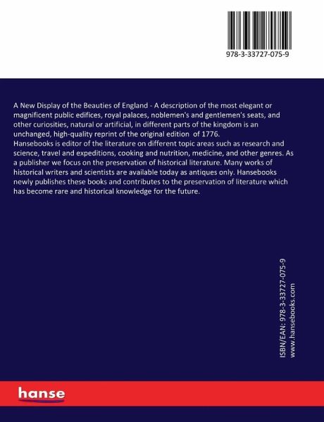 A New Display of the Beauties of England - A description of the most elegant or magnificent public edifices, royal palaces, noblemen's and gentlemen's seats, and other curiosities, natural or artificial, in different parts of the kingdom is an unchanged, high-quality reprint of the original edition of 1776.Hansebooks is editor of the literature on different topic areas such as research and science, travel and expeditions, cooking and nutrition, medicine, and other genres. As a publisher we focus on the preservation of historical literature. Many works of historical writers and scientists are available today as antiques only. Hansebooks newly publishes these books and contributes to the preservation of literature which has become rare and historical knowledge for the future.