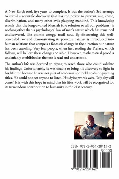 ¿A New Earth took five years to complete. It was the author's 3rd attempt to reveal a scientific discovery that has the power to prevent war, crime, discrimination, and many other evils plaguing mankind. This knowledge reveals that the long-awaited Messiah (the solution to all our problems) is nothing other than a psychological law of man's nature which has remained undiscovered, like atomic energy, until now. By discovering this well-concealed law and demonstrating its power, a catalyst is introduced into human relations that compels a fantastic change in the direction our nature has been traveling. Very few people, when first reading the Preface, which follows, will believe these changes possible. However, mathematical proof is undeniably established as the text is read and understood.¿