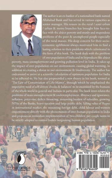 The author is an ex-banker of a nationalized bank named Allahabad Bank and has served in various capacities as senior manager. His tenure in the rural / semi urban / urban & metro branches has brought him face-to-face with the abject poverty and sturdy and stupendous problems of the poor & unemployed people especially of the rural masses. His deep concern for their socio-economic upliftment always motivated him to find a lasting solution to their problems which culminated in the form of this book. The book deals with the problem of over population of India and its byproducts like abject poverty, mass unemployment and growing pollution level in India. It takes up the impact of over population on our environment, causing global warming, in addition to creating a threat to our environment & biodiversity. The author has endeavored to arrive at a scientific calculation of optimum population for India to be adhered to. He has also propounded a new theory in his book, termed as 'The Law of Conservation of Life-Matter', through which he emphasized the imperative need of self-driven 'checks & balances' to be excersized by the humans of the whole world in general and Indians in particular. The book inter-relates the problems of mass unemployment & underemployment, illiteracy and ignorance, inflation, price-rise, deficit financing, mounting burden of subsidies, growing NPAs of the Banks, heavy taxation and large public debt, falling value of Rupee in international market, the mounting foreign debt, child labour and women empowerment directly with the phenomenon of over-human population in India and proposes an immediate implementation of 'two-children' per couple norm to be strictly adopted to control India's burgeoning human population.