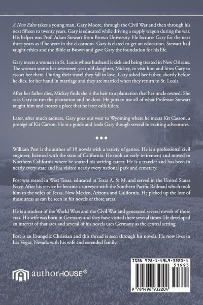 A New Eden takes a young man, Gary Moore, through the Civil War and then through his next fifteen to twenty years. Gary is educated while driving a supply wagon during the war. His helper was Prof. Adam Stewart from Brown University. He lectures Gary for the next three years as if he were in the classroom. Gary is elated to get an education. Stewart had taught ethics and the Bible at Brown and gave Gary the foundation for his life. Gary meets a woman in St. Louis whose husband is sick and being treated in New Orleans. The woman wants her seventeen-year-old daughter, Mickey, to visit him and hires Gary to escort her there. During their travel they fall in love. Gary asked her father, shortly before he dies, for her hand in marriage and they are married when they return to St. Louis. After her father dies, Mickey finds she is the heir to a plantation that her uncle owned. She asks Gary to run the plantation and he does. He puts to use all of what Professor Stewart taught him and creates a place that he later calls Eden. Later, after much sadness, Gary goes out west to Wyoming where he meets Kit Casson, a protégé of Kit Carson. He is a guide and leads Gary though several to exciting adventures.