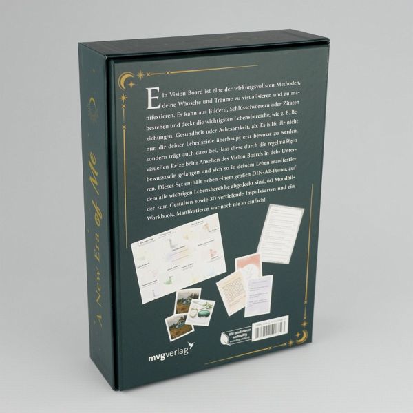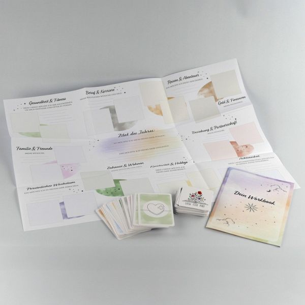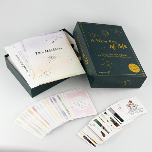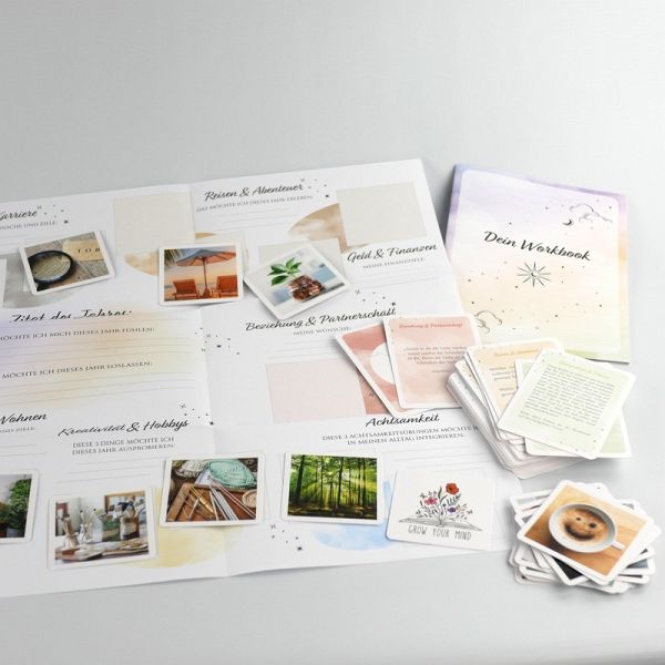 Ein Vision Board ist eine der wirkungsvollsten Methoden, deine Wünsche und Träume zu visualisieren und zu manifestieren. Es kann aus Bildern, Schlüsselwörtern oder Zitaten bestehen und deckt die wichtigsten Lebensbereiche, wie z. B. Beziehungen, Gesundheit oder Achtsamkeit, ab. Es hilft dir nicht nur, dir deiner Lebensziele überhaupt erst bewusst zu werden, sondern trägt auch dazu bei, dass diese durch die regelmäßigen visuellen Reize beim Ansehen des Vision Boards in dein Unterbewusstsein gelangen und sich so in deinem Leben manifestieren. Dieses Set enthält neben einem großen DIN-A2-Poster, auf dem alle wichtigen Lebensbereiche abgedeckt sind, 60 Moodbilder zum Gestalten sowie 30 vertiefende Impulskarten und ein Workbook. Manifestieren war noch nie so einfach!