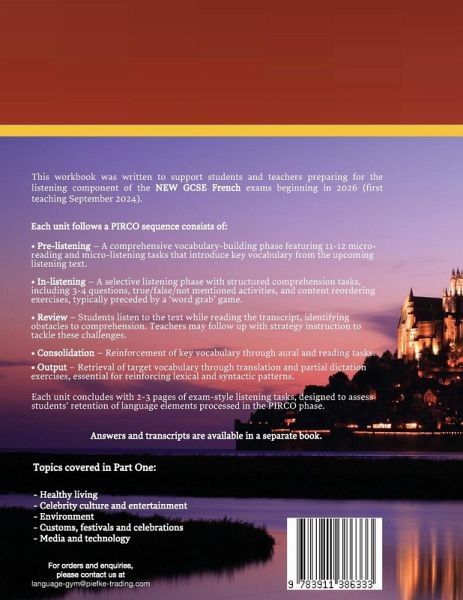 This workbook was written to support students and teachers preparing for the listening component of the NEW GCSE French exams beginning in 2026 (first teaching September 2024). Each unit follows a PIRCO sequence consists of: ¿ Pre-listening - A comprehensive vocabulary-building phase featuring 11-12 microreading and micro-listening tasks that introduce key vocabulary from the upcoming listening text. ¿ In-listening - A selective listening phase with structured comprehension tasks, including 3-4 questions, true/false/not mentioned activities, and content reordering exercises, typically preceded by a 'word grab' game. ¿ Review - Students listen to the text while reading the transcript, identifying obstacles to comprehension. Teachers may follow up with strategy instruction to tackle these challenges. ¿ Consolidation - Reinforcement of key vocabulary through aural and reading tasks. ¿ Output exercises, essential for reinforcing lexical and syntactic patterns. - Retrieval of target vocabulary through translation and partial dictation students' retention of language elements processed in the PIRCO phase. Each unit concludes with 2-3 pages of exam-style listening tasks, designed to assess Topics covered in Part One: Healthy living Celebrity culture and entertainment Environment Customs, festivals and celebrations Media and technology Answers and transcripts are available in a separate book. For orders and enquiries, please contact us at language-gym@piefke-trading.com