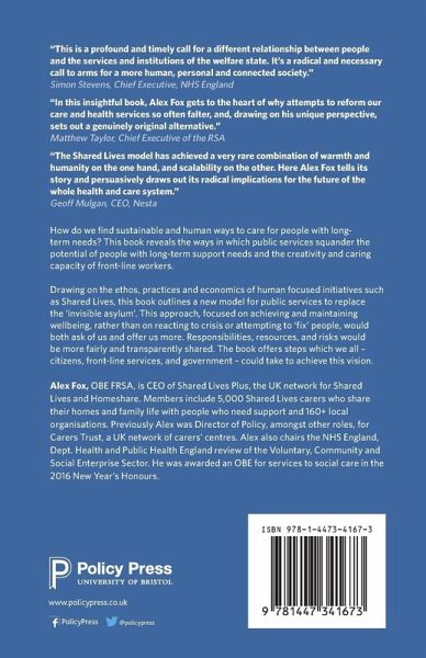 Alex Fox OBE FRSA is CEO of Shared Lives Plus, the UK network for Shared Lives and Homeshare. Members include 5,000 Shared Lives carers who share their homes and family life with people who need support and 160+ local organisations. Previously Alex was Director of Policy amongst other roles for the Carers' Trust, a UK network of carers' centres. Alex also chairs the NHS England, Dept. Health and Public Health England review of the Voluntary, Community and Social Enterprise Sector. He was awarded an OBE for services to social care in the 2016 New Year's Honours.