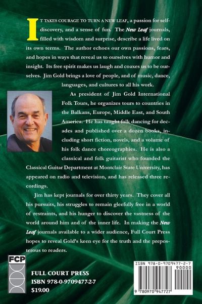 It takes couraghe to turn a new leaf, a passion for self-discovery, and a sense of fun. The New Leaf journals, filled with wisdom and surprise, describe a life lived onits own terms. The author echoes our own passions, fears, and hopes in ways that reveal us to ourselves with humor and insight. Its free spirit makes us laugh and coaxes us to be ourselves. Jim Gold brings a love of people, and of music, dance, languages, and cultures to all his work. As president of Jim Gold International FolkTours, he organizes tours to countries in the Balkans, Europe, Middle East, and South America. He has taught folk dancing for decades and published over a dozen books, including short fiction, novels, and a volume of his folk dance choreographies. He is also a classical and folk guitarist who founded the Classical Guitar Department at Montclair State University, has appeared on radio and television, and has released three recordings. Jim has kept journals for over thirty years. They cover allhis pursuits, his struggles to remain gleefully free in a world of restraints, and his hunger to discover the vastness of the world around him and of the inner life. In making the New Leaf journals available to a wider audience, Full Court Press hopes to reveal Gold's keen eye for the truth and the preposterous to readers.