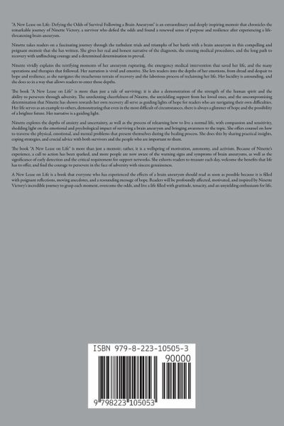 "A New Lease on Life: Defying the Odds of Survival Following a Brain Aneurysm" is an extraordinary and deeply inspiring memoir that chronicles the remarkable journey of Ninette Victory, a survivor who defied the odds and found a renewed sense of purpose and resilience after experiencing a life-threatening brain aneurysm. Ninette takes readers on a fascinating journey through the turbulent trials and triumphs of her battle with a brain aneurysm in this compelling and poignant memoir that she has written. She gives her real and honest narrative of the diagnosis, the ensuing medical procedures, and the long path to recovery with unflinching courage and a determined determination to prevail. Ninette vividly explains the terrifying moments of her aneurysm rupturing, the emergency medical intervention that saved her life, and the many operations and therapies that followed. Her narration is vivid and emotive. She lets readers into the depths of her emotions, from dread and despair to hope and resilience, as she navigates the treacherous terrain of recovery and the laborious process of reclaiming her life. Her lucidity is astounding, and she does so in a way that allows readers to enter those depths. The book "A New Lease on Life" is more than just a tale of surviving; it is also a demonstration of the strength of the human spirit and the ability to persevere through adversity. The unrelenting cheerfulness of Ninette, the unyielding support from her loved ones, and the uncompromising determination that Ninette has shown towards her own recovery all serve as guiding lights of hope for readers who are navigating their own difficulties. Her life serves as an example to others, demonstrating that even in the most difficult of circumstances, there is always a glimmer of hope and the possibility of a brighter future. Her narrative is a guiding light. Ninette explores the depths of anxiety and uncertainty, as well as the process of relearning how to live a normal life, with compassion and sensitivity, shedding light on the emotional and psychological impact of surviving a brain aneurysm and bringing awareness to the topic. She offers counsel on how to traverse the physical, emotional, and mental problems that present themselves during the healing process. She does this by sharing practical insights, coping strategies, and crucial advice with both survivors and the people who are important to them. The book "A New Lease on Life" is more than just a memoir; rather, it is a wellspring of motivation, autonomy, and activism. Because of Ninette's experience, a call to action has been sparked, and more people are now aware of the warning signs and symptoms of brain aneurysms, as well as the significance of early detection and the critical requirement for support networks. She exhorts readers to treasure each day, welcome the benefits that life has to offer, and find the courage to persevere in the face of adversity with sincere genuineness. A New Lease on Life is a book that everyone who has experienced the effects of a brain aneurysm should read as soon as possible because it is filled with poignant reflections, moving anecdotes, and a resounding message of hope. Readers will be profoundly affected, motivated, and inspired by Ninette Victory's incredible journey to grasp each moment, overcome the odds, and live a life filled with gratitude, tenacity, and an unyielding enthusiasm for life.