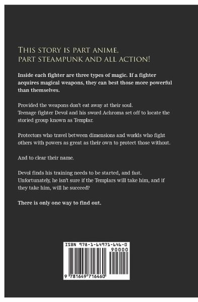 This story is part anime, part steampunk and all action! Inside each fighter are three types of magic. If a fighter acquires magical weapons, they can best those more powerful than themselves. Provided the weapons don't eat away at their soul. Teenage fighter Devol and his sword Achroma set off to locate the storied group known as Templar. Protectors who travel between dimensions and worlds who fight others with powers as great as their own to protect those without. And to clear their name. Devol finds his training needs to be started, and fast. Unfortunately, he isn't sure if the Templars will take him, and if they take him, will he succeed? There is only one way to find out.