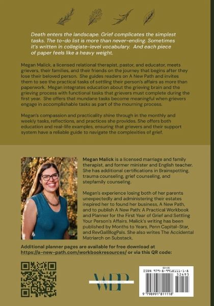 Death enters the landscape. Grief complicates the simplest tasks. The to-do list is more than never-ending. Sometimes it's written in collegiate-level vocabulary. And each piece of paper feels like a heavy weight. Megan Malick, a licensed relational therapist, pastor, and educator, meets grievers, their families, and their friends on the journey that begins after they lose their beloved person. She guides readers on A New Path and invites them to see the practical tasks of settling their person's affairs as more than paperwork. Megan integrates education about the grieving brain and the grieving process with functional tasks that grievers must complete during the first year. She offers that mundane tasks become meaningful when grievers engage in accomplishable tasks as part of the mourning process. Megan's compassion and practicality shine through in the monthly and weekly tasks, reflections, and practices she provides. She offers both education and real-life examples, ensuring that grievers and their support system have a reliable guide to navigate the complexities of grief.