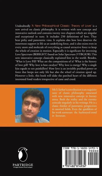 Undoubtedly 'A New Philosophical Classic: Theory of Love' is a new arrival on classic philosophy. It is written with new concept and innovative outlook and contains twenty two chapters which are singular and exceptional in tune. It includes 250 definitions of love. They bear pithy and panoramic vista. It explains also how love deserves the innermost support in life as an underlying force, and it also exists even in every atom and molecule of everything as causal attractive force to keep the whole of creation in motion. Especially it is significant for inventing Love Spectrum (BERIGHT) based on Solar Spectrum (VYBGIOR).This new innovative concept classically explained first in the world. Besides, 'What is Love Pill? What are the compositions of it? What is the history of love pill? Why love is best catalyst? Why love is energy? Why a single kiss equals to ten painkillers? How love is an invisible purified power or force that keeps not only life but also the wheel of creation speed up. However a little, this book will slake the parched heart of the different interested fond readers irrespective of caste and creed.
