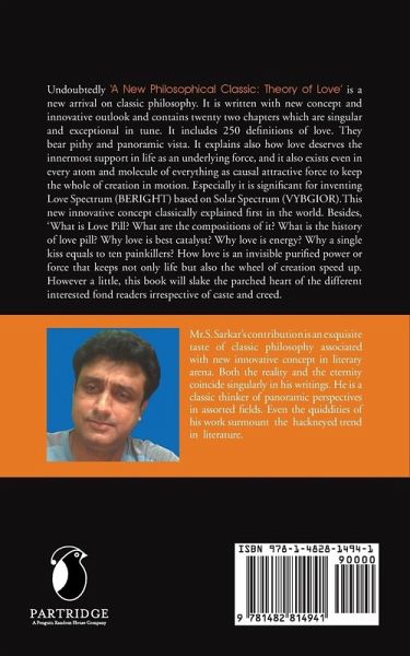 Undoubtedly 'A New Philosophical Classic: Theory of Love' is a new arrival on classic philosophy. It is written with new concept and innovative outlook and contains twenty two chapters which are singular and exceptional in tune. It includes 250 definitions of love. They bear pithy and panoramic vista. It explains also how love deserves the innermost support in life as an underlying force, and it also exists even in every atom and molecule of everything as causal attractive force to keep the whole of creation in motion. Especially it is significant for inventing Love Spectrum (BERIGHT) based on Solar Spectrum (VYBGIOR).This new innovative concept classically explained first in the world. Besides, 'What is Love Pill? What are the compositions of it? What is the history of love pill? Why love is best catalyst? Why love is energy? Why a single kiss equals to ten painkillers? How love is an invisible purified power or force that keeps not only life but also the wheel of creation speed up. However a little, this book will slake the parched heart of the different interested fond readers irrespective of caste and creed.