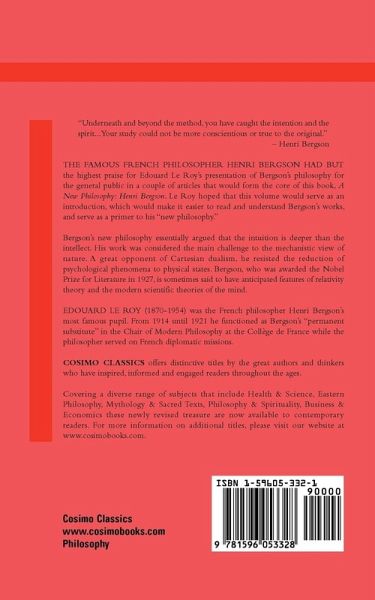 "Underneath and beyond the method, you have caught the intention and the spirit...Your study could not be more conscientious or true to the original." - Henri Bergson The famous French philosopher Henri Bergson had but the highest praise for Edouard le Roy's presentation of Bergson's philosophy for the general public in a couple of articles that would form the core of this book, A New Philosophy: Henri Bergson: Henri Bergson. Le Roy hoped that this volume would serve as an introduction, which would make it easier to read and understand Bergson's works, and serve as a primer to his "new philosophy." Bergson's new philosophy essentially argued that the intuition is deeper than the intellect. His work was considered the main challenge to the mechanistic view of nature. A great opponent of Cartesian dualism, he resisted the reduction of psychological phenomena to physical states. Bergson, who was awarded the Nobel Prize for Literature in 1927, is sometimes said to have anticipated features of relativity theory and the modern scientific theories of the mind. EDOUARD LE ROY (1870-1954) was the French philosopher Henri Bergson's most famous pupil. From 1914 until 1921 he functioned as Bergson's "permanent substitute" in the Chair of Modern Philosophy at the Collège de France while the philosopher served on French diplomatic missions.