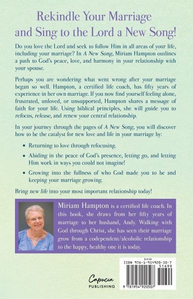 Rekindle Your Marriage and Sing to the Lord a New Song! ¿¿¿¿ Do you love the Lord and seek to follow Him in all areas of your life, including your marriage? In A New Song, Miriam Hampton outlines a path to God's peace, love, and harmony in your relationship with your spouse. Perhaps you are wondering what went wrong after your marriage began so well. Hampton, a certified life coach, has fifty years of experience in her own marriage. If you now find yourself feeling alone, frustrated, unloved, or unsupported, Hampton shares a message of faith for your life. Using biblical principles, she will guide you to refocus, release, and renew your central relationship. In your journey through the pages of A New Song, you will discover how to be the catalyst for new love and life in your marriage by: Returning to love through refocusing. Abiding in the peace of God's presence, letting go, and letting Him work in ways you could not imagine! Growing into the fullness of who God made you to be and keeping your marriage growing. Bring new life into your most important relationship today!